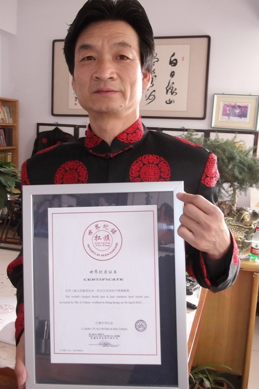 World Record Title: The world's largest bottle pen is stainless steel bottle pen invented by Mr. Li Yihao. verified in Hong Kong on 30 April 2013.