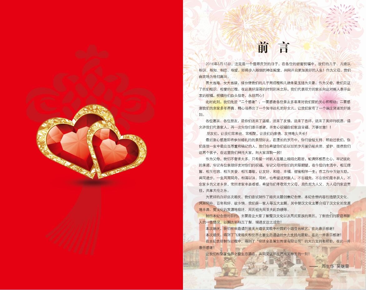World Record Title: The Zhou Yucheng & Zhu Manyu Wedding Invitation Card & Commemorative Album designed by Mr. Zhou Shenghua and Ms. Wu Jirong is the world's first ever wedding invitation card and commemorative album.