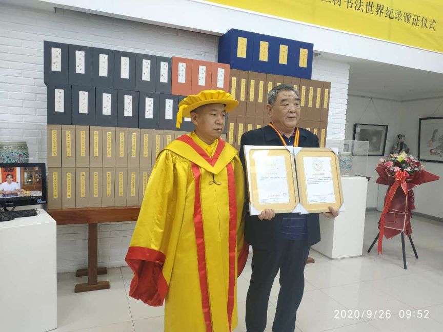 World Record Title: Mr. Zhang Shumin is the person who writes the most in three materials (bamboo slips/Zhujian, paper/Zhiben and silk/Juanben) in Xiaokai in the world.