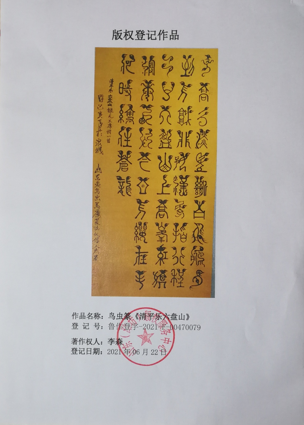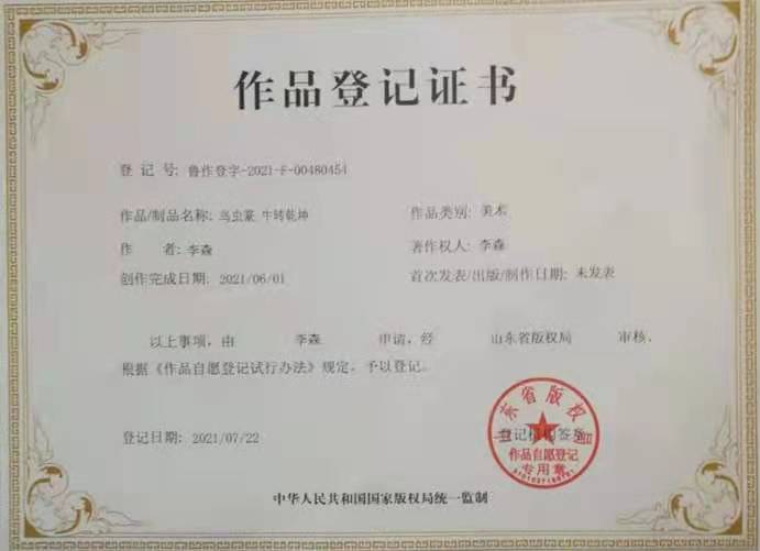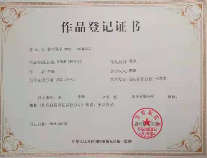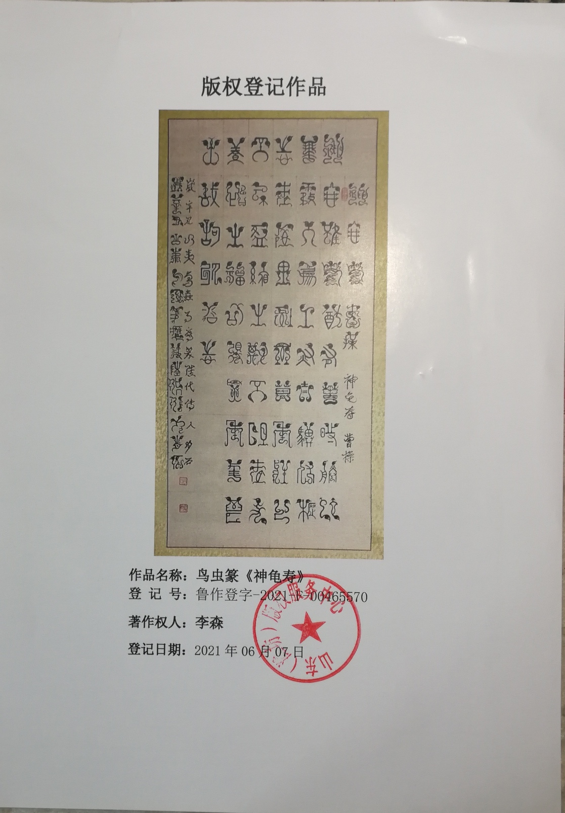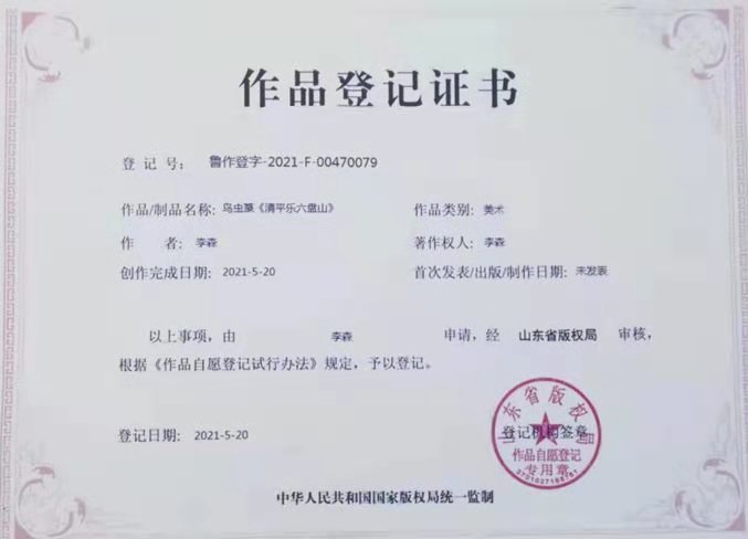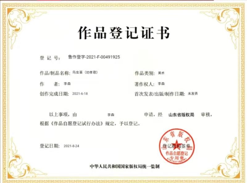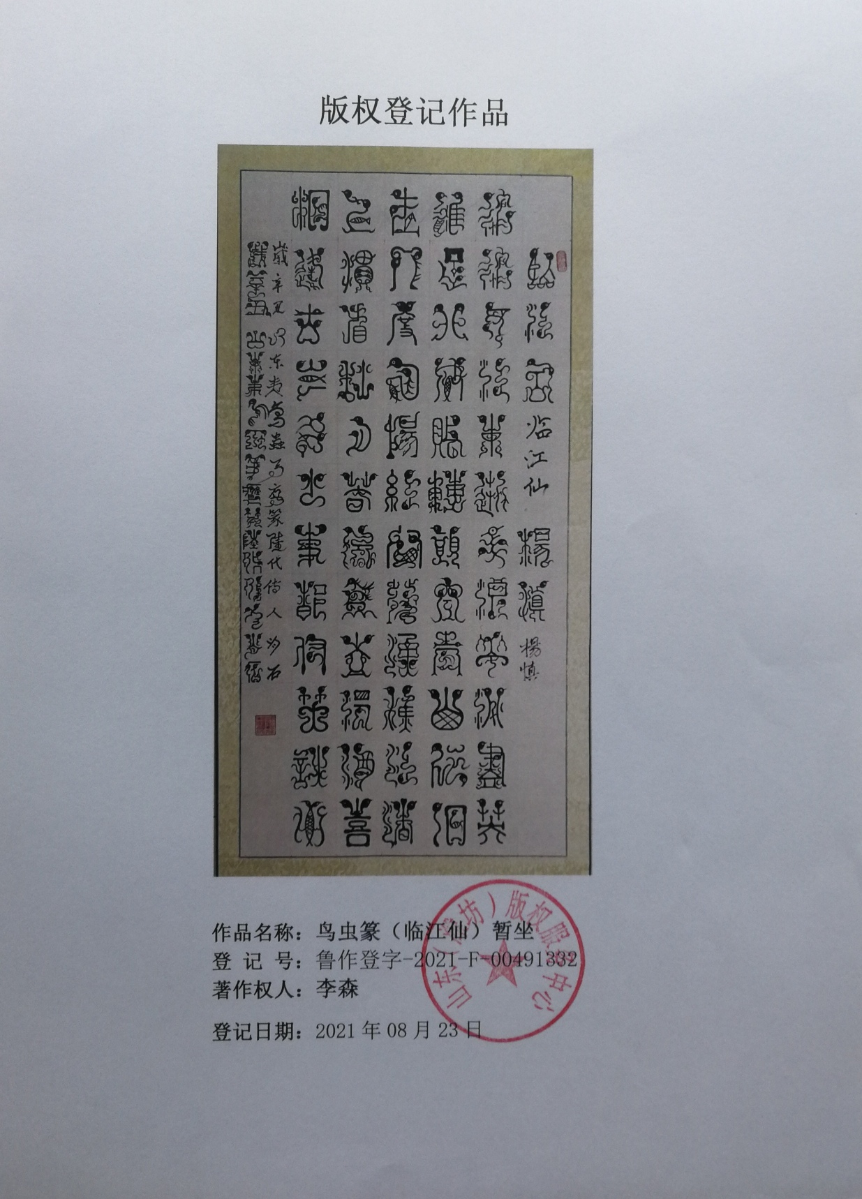 Mr. Li Sen is the person who owns the largest number of copyright "Work Registration Certificates" of Bird-and-Insect Script in the world. Verified in Shandong on 30 September 2021.