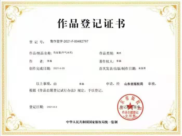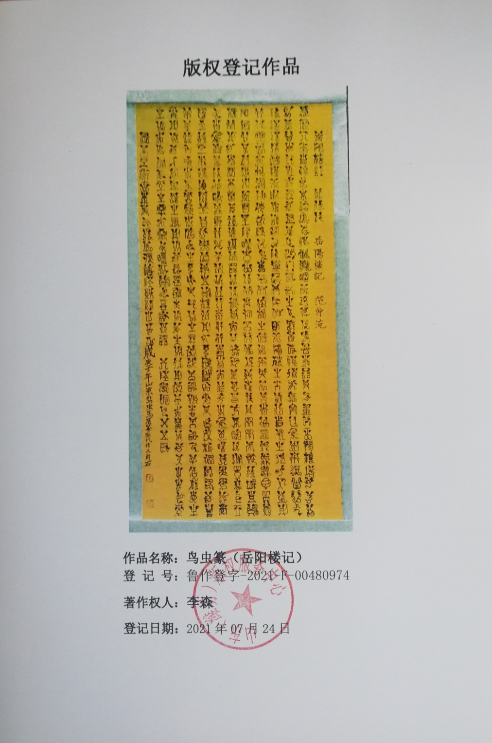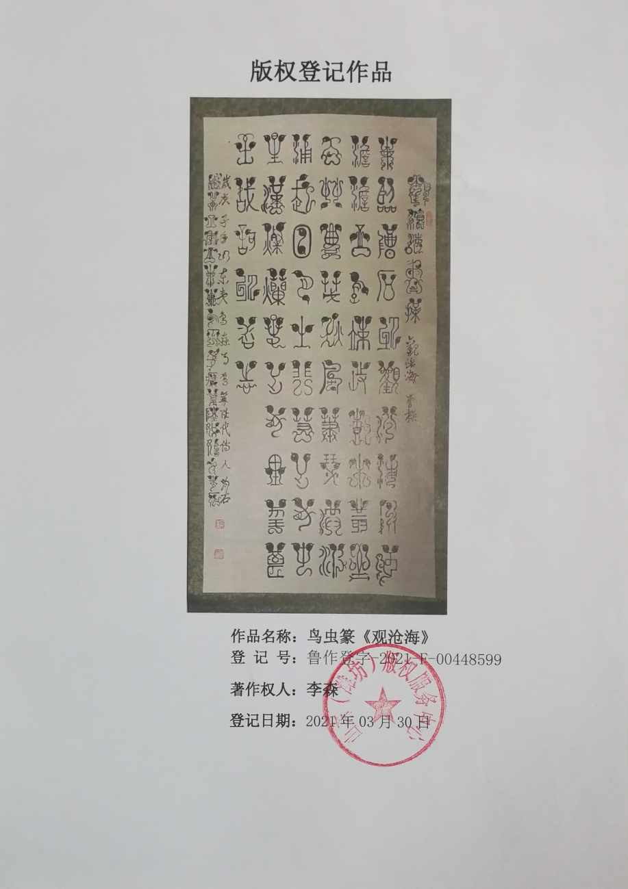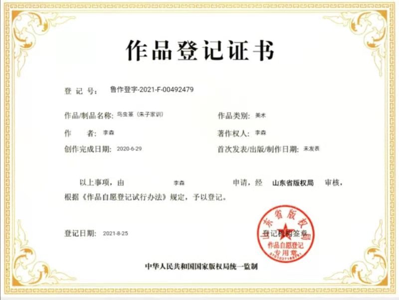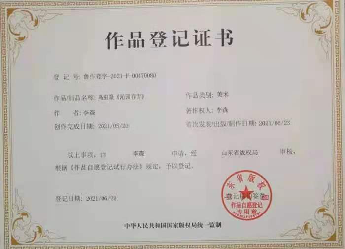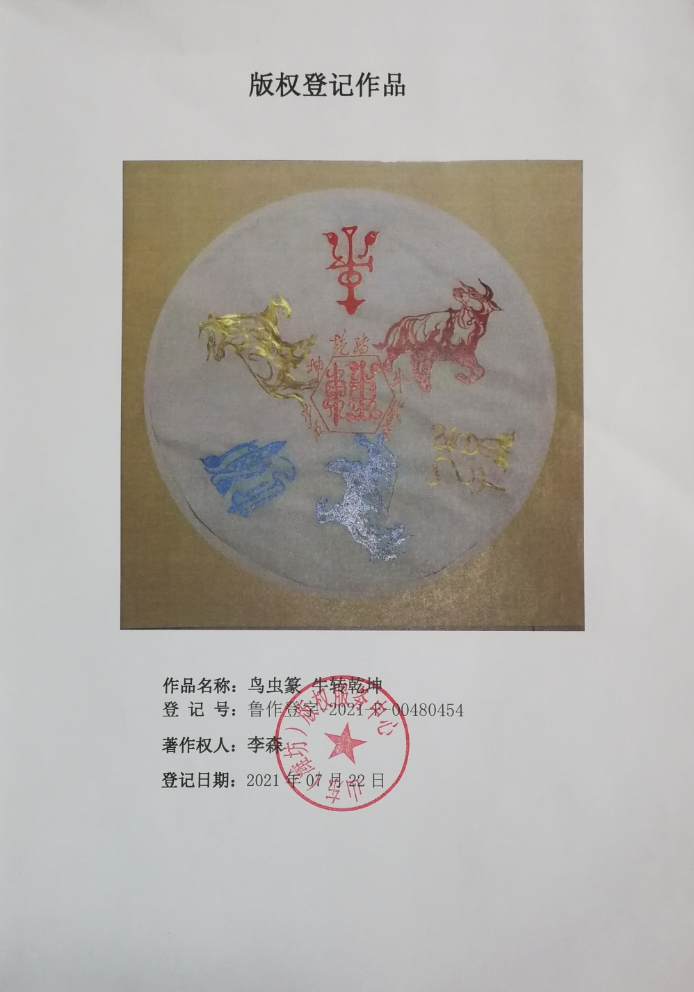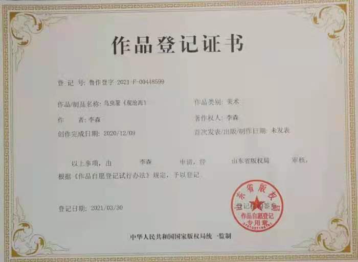 Mr. Li Sen is the person who owns the largest number of copyright "Work Registration Certificates" of Bird-and-Insect Script in the world. Verified in Shandong on 30 September 2021.