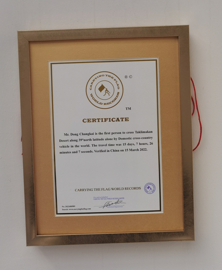 World Record Title: Mr. Dong Changkai is the first person to cross Taklimakan Desert along 39°north latitude alone by Domestic cross-country vehicle in the world.