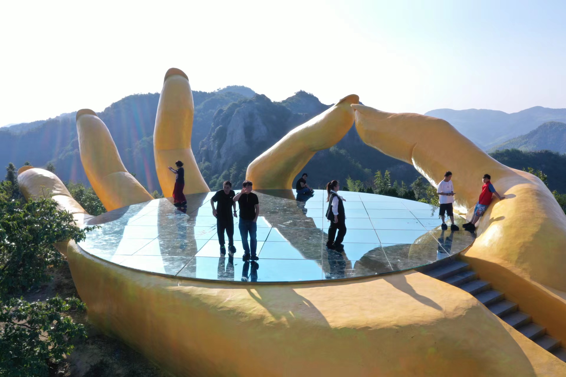 World Record Value: The arm length of the bergamot platform in Wuzhiyan Scenic Spot is 15.8 meters, the width at the widest part is 7.6 meters, and the area is 175 square meters; the length of the longest part of the palm is 12.8 meters, and the width at the widest part is 11.6 meters; the area of the glass platform is 99 square meters and the diameter is 11.2 meters; the height of the 5 fingers, the data of the thickest part of the 5 fingers: the thumb is 6 meters long, the circumference of the thickest part is 6 meters; the index finger is 7 meters long, and the circumference of the thickest part is 5.95 meters; the middle finger The height is 9 meters and the circumference at the thickest part is 6 meters; the ring finger is 7.8 meters high and the circumference at the thickest part is 7.8 meters; the little finger is 6.3 meters high and the circumference at the thickest part is 5.6 meters.