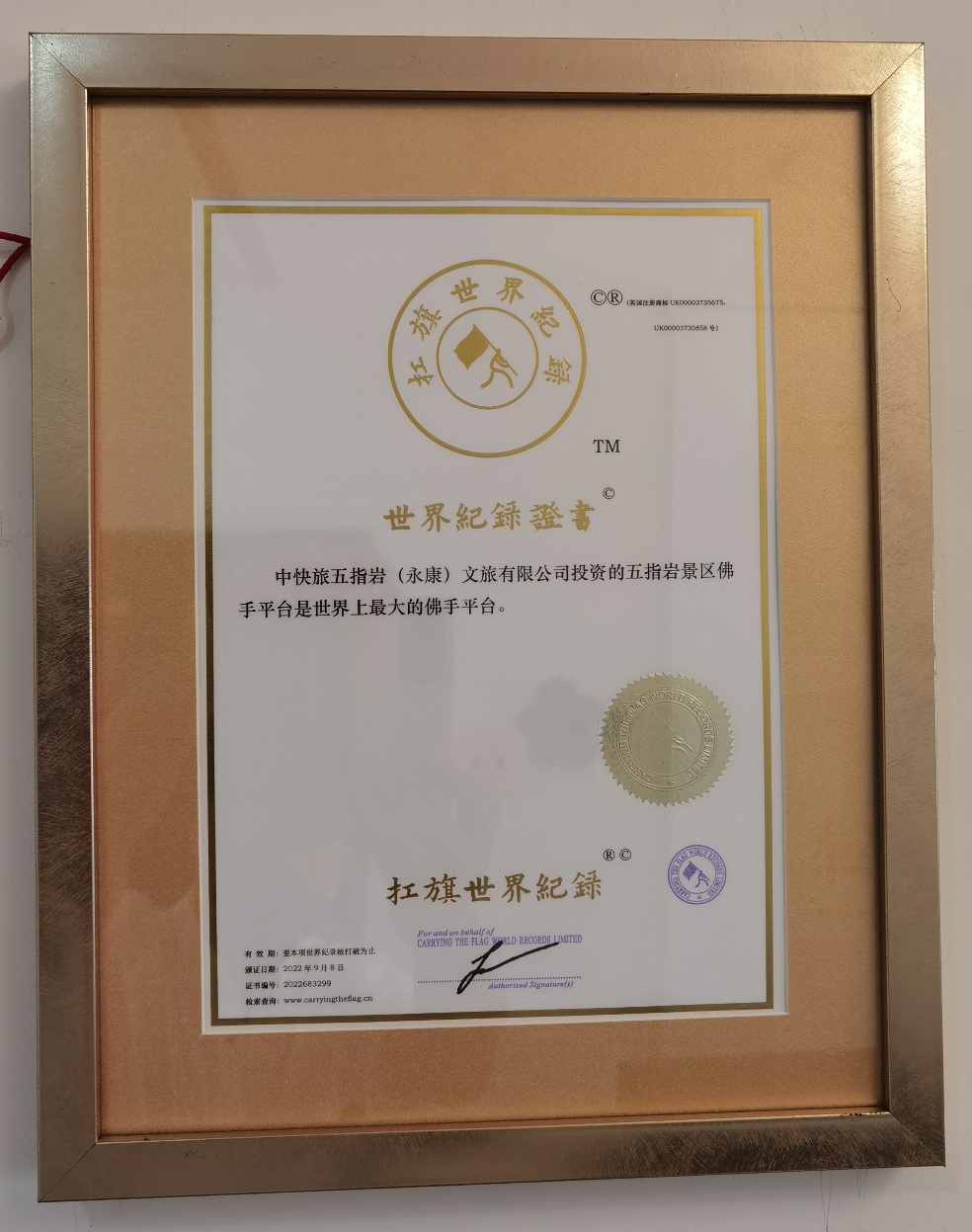 ZhongKuaiLv Wuzhiyan (Yongkang) Cultural Tourism Co., Ltd. invests in the Wuzhiyan Scenic Spot "Buddhashou" platform is the largest " Buddhashou " platform in the world. Verified in China on 8 September 2022.