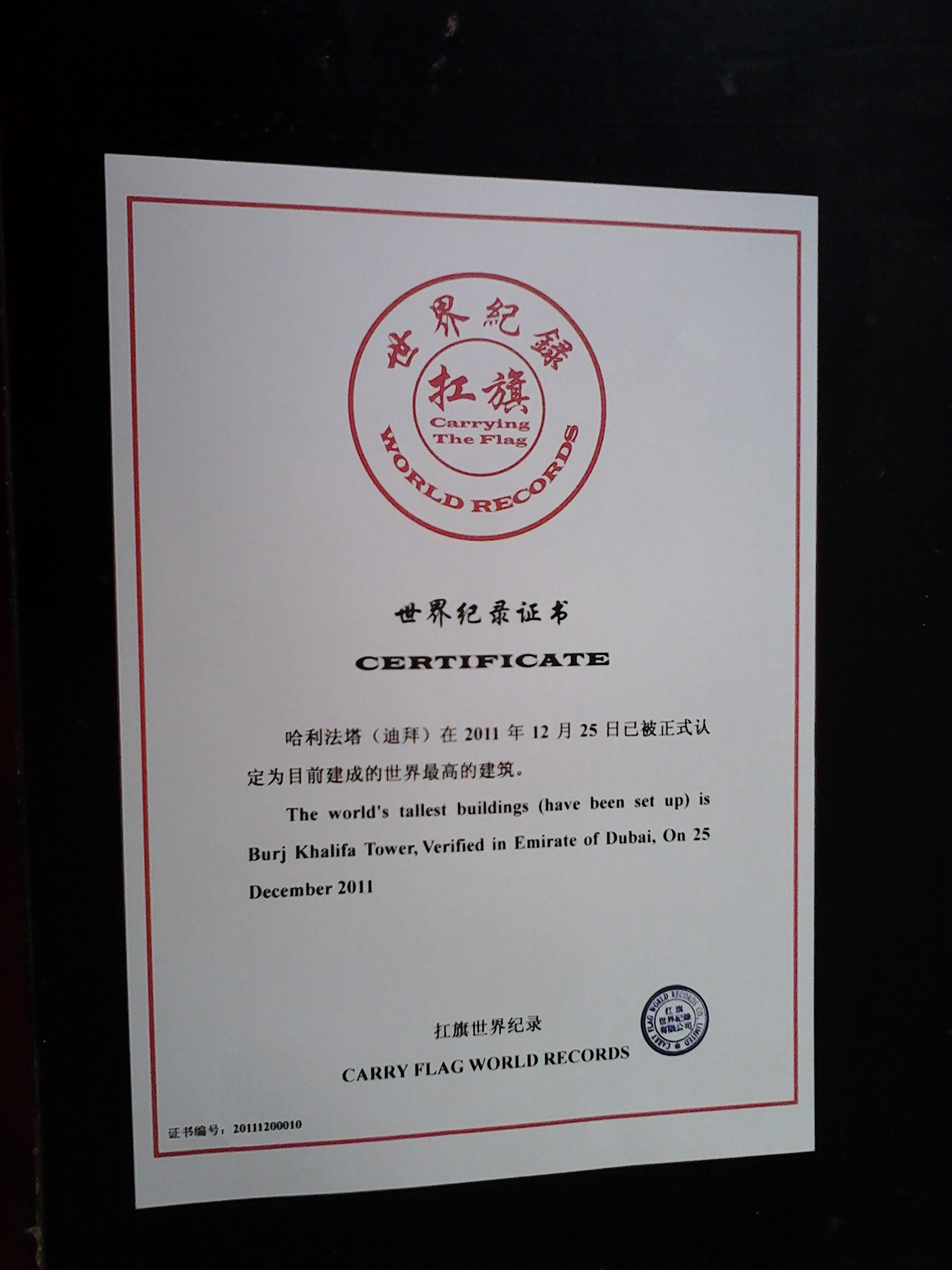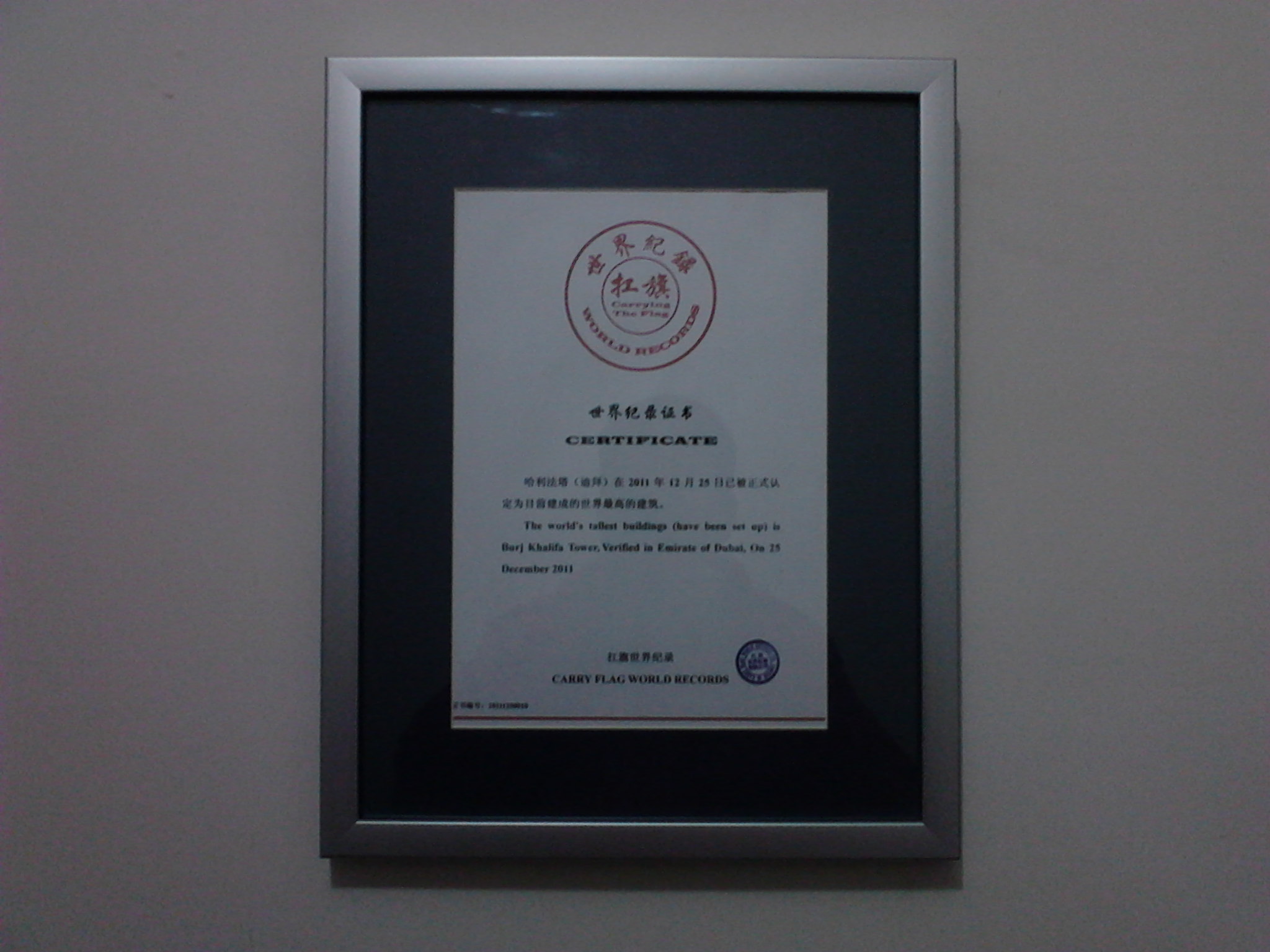 First, carrying the flag of World Records certificate and is equipped with stylish silver large frame (32CM * 40CM):