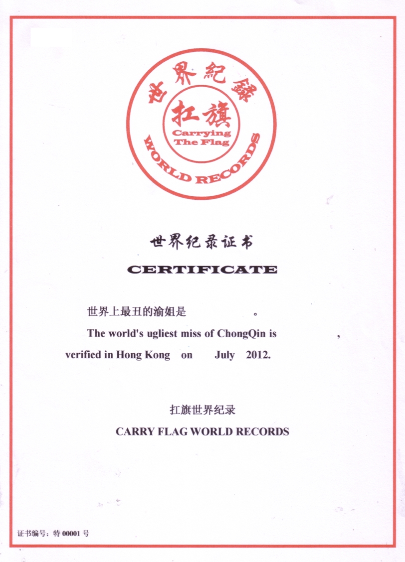 Carry the flag of World Records World Records was first introduced special blank No. 00001, this world record certificate by Inter users to fill out, please do you think is the most ugly Chongqing sister's name written on the title of the message sending mail directly to s @ kangqi. org
