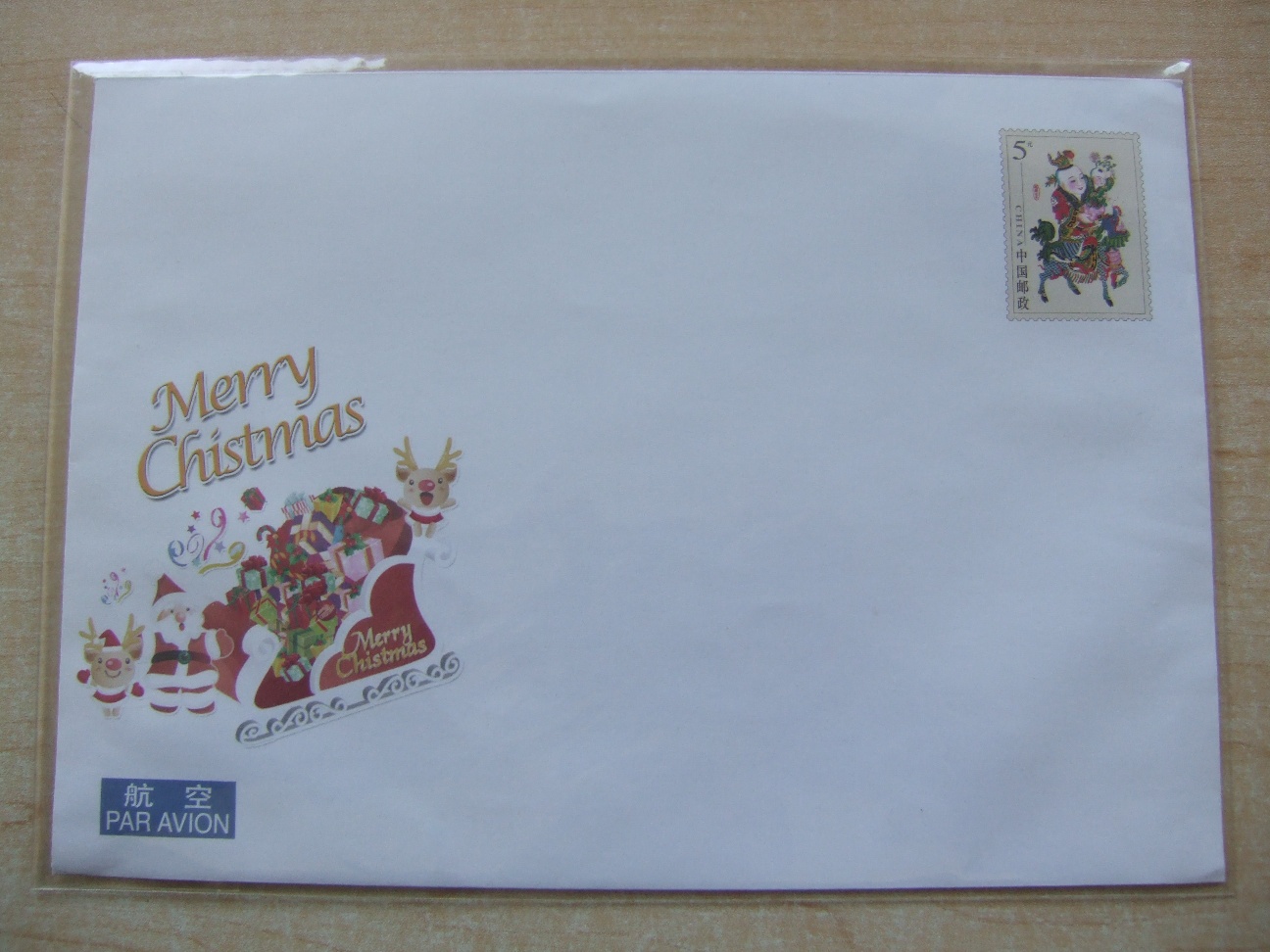 World Record rules: wrong postal seal. International postage postage Special Greeting letters Pictured unicorn sons, namely Christmas closure map is patterned Special Air International postage envelope. Christmas English as CHRISTMAS, designers missing R, and thus become the world's largest official stamp issued an error. This picture shows the wrong seal master English CHISTMAS (drain write "R") and Santa Claus, reindeer, sleigh loaded with gifts, aviation flag, postage Pictured Yangliuqing - Kirin sons, envelope size: 229 × 162mm, typo Figure area: 80 × 75mm, rear inscribed State Post Bureau issued (2005), issue number 08-370831-12-0002-000, missing all three MERRY CHRISTMAS write R.