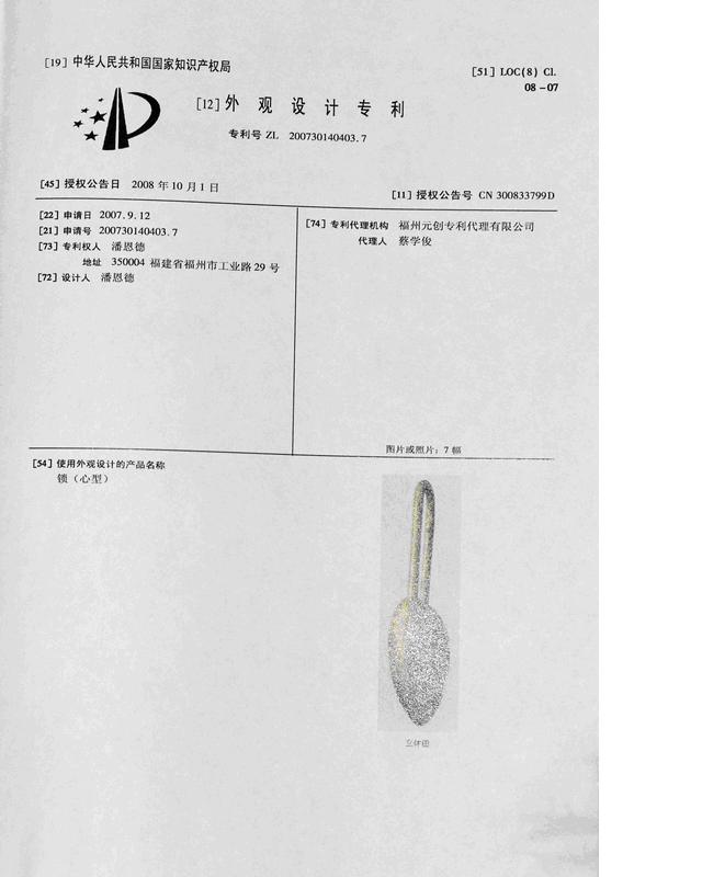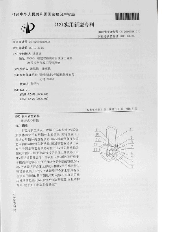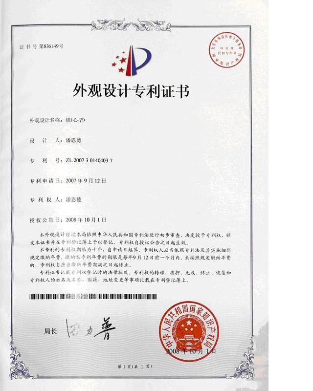 Mr. Pan Ende application for the world record success stories: the world's first to have both design patents and utility models, two heart-shaped lock(Hits: )