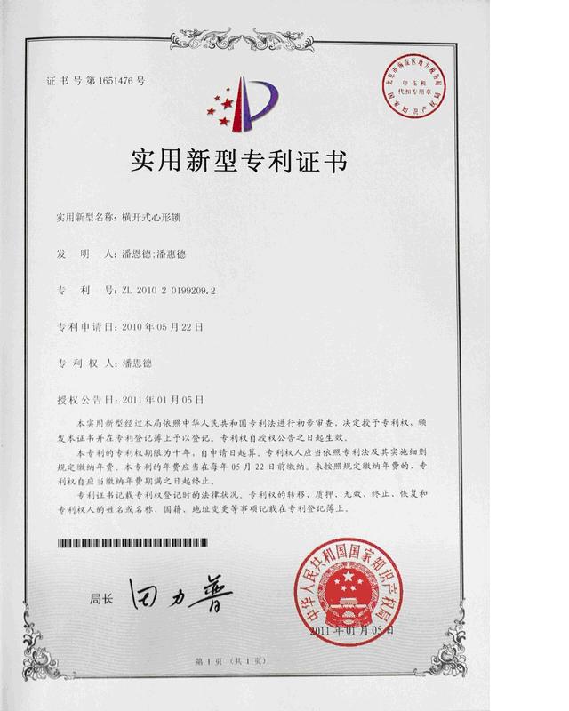 World Record Name: the world's first to have both design patents and utility models, two heart-shaped lock is Mr. Pan Ende made ​​heart-shaped lock.