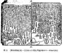"Chip chart compiled" a total of 13 volumes, lines 1556 (Jiajing thirty-five years) Zongxian Governor of Zhejiang military affairs, in order to defense pirates, who hired Cheng Hai Phong, who collect information compiled from membership of a coastal military figure, initially engraved in 1562 (Jiajing forty-one). "Chip chart compiled" in the "coastal mountain sand map", is by far the earliest that can be seen, the contents of detailed preparation and complete Haiphong military topographic maps.
