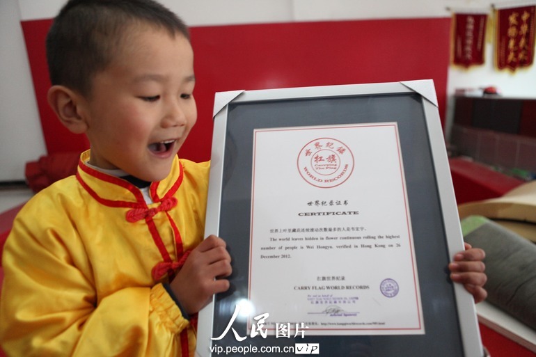 December 27, 2012, Chongqing Dazu District Wan Town Peng Yi martial arts, the 6-year-old children Weihong Yu received a world record certificate. (Solemnly : Where to with the "People Pictures" word picture rights reserved. Share figure Tel 010-65368421)